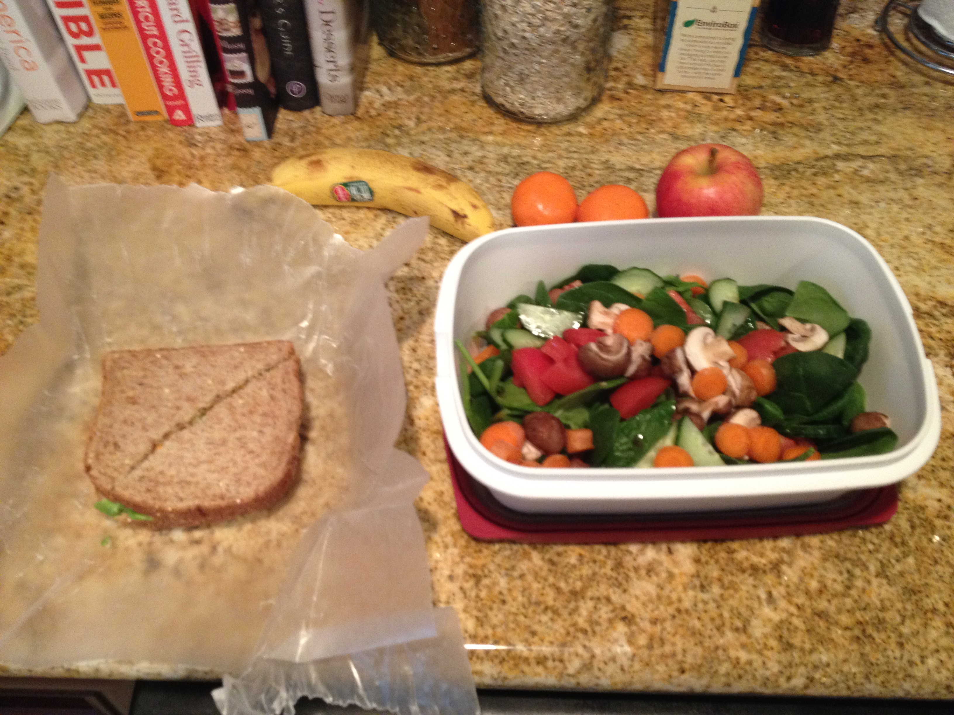 Spinach salad with cucumbers, tomatoes, mushrooms and carrots along with a avocado sandwich and plenty of fruit for noshing.