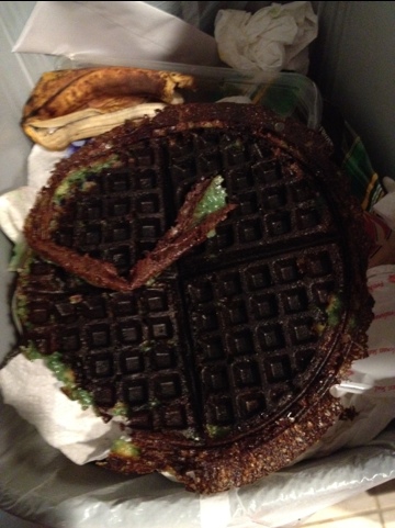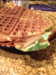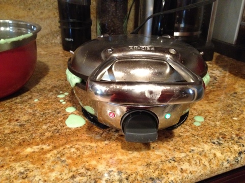 I woke up with grand plans to make His and Hers green waffles. I was going to make mine with whole wheat flour, agave, coconut oil, etc. For Will, the trusty BisQuixk.