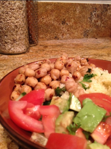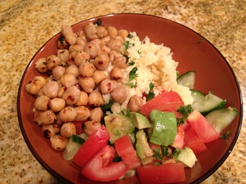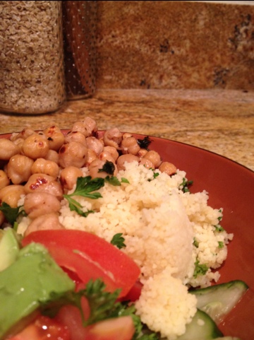 For some vegetables, I made a quick side salad with tomatoes, cucumbers, avocado and some parsley and lemon juice. To tie the parsley in, I stirred a few chopped sprigs in with the resting couscous and over the top of the chickpeas, which had started to brown by the time I finished the salad.