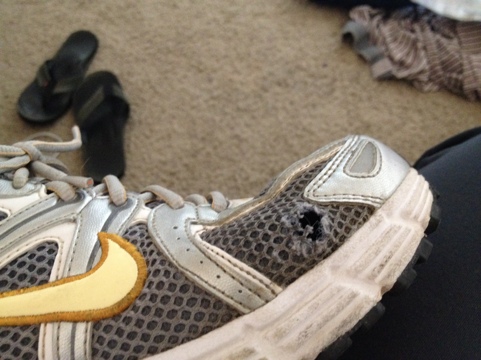 As I was getting dressed I noticed something disturbing – my sneaker has a hole! They both do right in the same place!