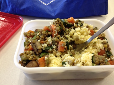 Today’s lunch: couscous with a lentil-vegetable mix. I made a huge batch yesterday, giving me lunch for at least two days. This is a ton of food – absolutely delicious and guilt-free.