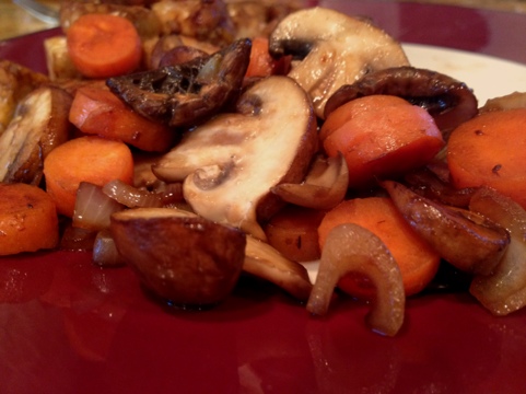 Am I the only one who feels a little daunted right after grocery shopping? I stock up on Sunday and then Monday rolls around and I have so many options, I’m honestly not sure which to chose. I picked up a few veggies this week that aren’t normally in my meals, like cauliflower and potatoes, for variety’s sake but I wasn’t feeling creative enough to tackle those tonight. So I stuck to the basics and sautéed some shallots with carrots and mushrooms (also with a slash of soy sauce), and they ended up being excellent! I’m seriously debating polishing off the leftovers in a bit.