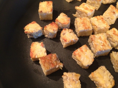 I was surprised that they made absolutely no noise during the cooking process. This is exactly the same way I cook tofu and when I drop those cubes on the skillet, they sizzle up a storm. I guess that’s because tofu is very moist where as tempeh, being vacuum packed and all, is not.