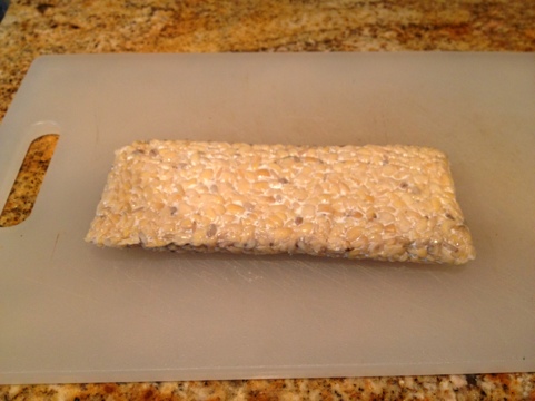 If you’ve never seen tempeh before, that’s not surprising. The only “mainstream” grocery store I see it at is Trader Joe’s (where this package is from). Usually I would go somewhere like Whole Foods or Mother’s Market to buy it since it’s not exactly run of the mill. It’s a soy product made from fermenting cultures of soy beans and looks and smells along those same science experiment-like lines