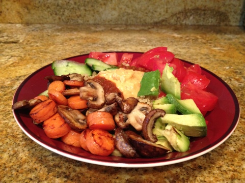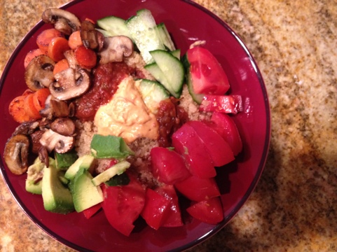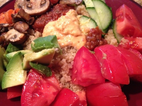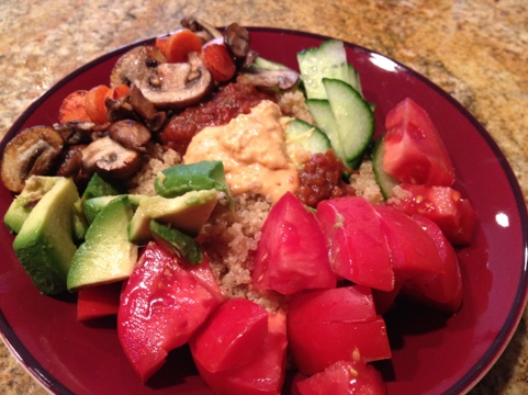Tonight was my veggie-loaded quinoa bowl, which is exactly what its name suggests. Quina with any and all the veggies I want.