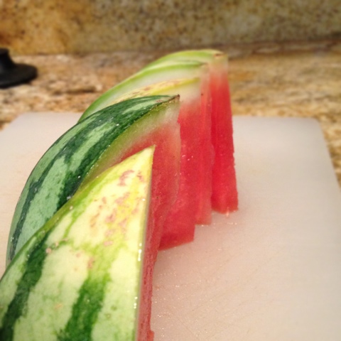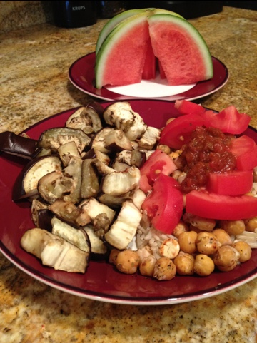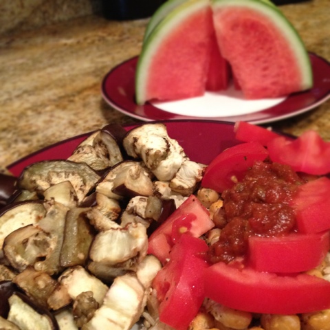 And on the side (meaning munched while I impatiently waited for the eggplant to cook) is my first watermelon of the season! Melons are some of my favorite fruits and a reason to look forward to summer. As we get into that season, you’ll hear me long for winter more and more. I’ve always been the odd ball who likes winter more. Anyone else?