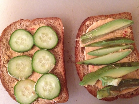 Avocado, cucumber and red pepper hummus. I’ll grab it from the fridge when I come home tomorrow afternoon and eat in the car on the way up to LAX so I’m not worried about it needing to stay cold.